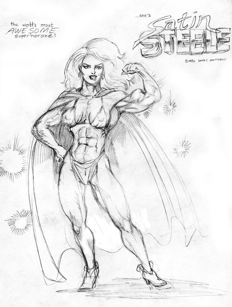 And here it is... from 1986, the very first drawing I did of this new character I'd just thought of: the heroic bodybuilder Satin Steele!